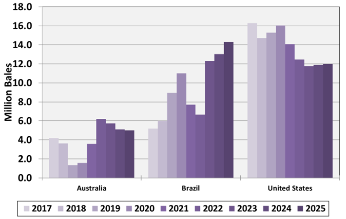 The United States had long been the world’s leading cotton exporter (Figure 1), with 87% of cotton production, on average, destined for export markets over the past decade (2016 – 2025). In 2016, U.S. cotton exports captured 39% of the global market, but this share has steadily declined since the onset of trade disputes with China. By 2023, the U.S. share in the global cotton market had fallen to 26%, its lowest point in over a decade. Although it rebounded slightly to 28% in 2024 and 2025, U.S. cotton has faced rising competitive pressures, particularly from Brazil. Brazil’s ability to double-crop cotton with other crops has driven substantial growth in its cotton production and exports. Consequently, Brazil has rapidly expanded its role in the global cotton market, surpassing U.S. cotton export volumes by 2023 and becoming the world’s leading cotton exporter. This shift is closely tied to China’s strategic diversification away from U.S. cotton, with Chinese investment in Brazilian infrastructure improving logistics, port access, and overall competitiveness.