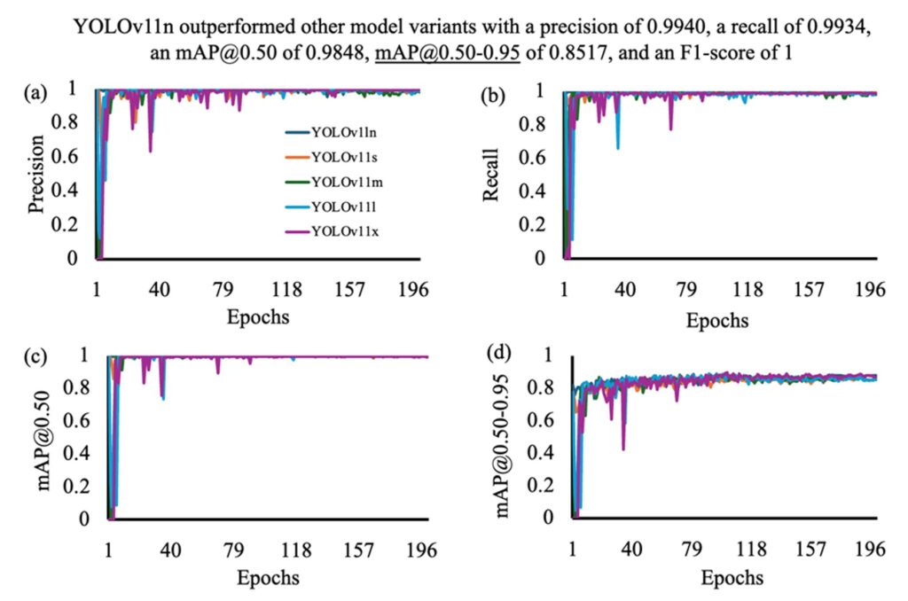 When comparing the performances of YOLO11 model variants, the YOLO11n model outperformed all other variants, with small variations across performance metrics. A closer look at its outcomes highlights a precision of 0.9940, a recall of 0.9934, mAP@0.50 of 0.9848, and mAP@0.50-0.95 of 0.8517 as the number of epochs increased (Figure 3). The performance metrics of YOLO11 varied among model variants as YOLO11m and YOLO11x variants resulted in the lowest precision among other model variants of YOLO11, i.e., a precision of 0.96, while other variants, such as YOLO11s, resulted in a precision of 0.9829, and the YOLO11l variant resulted in a precision of 0.9756. The YOLOv5nu and YOLO11n variants’mAP@0.50 score of (0.9834, and 0.9538) for ramp use detection further highlight the ability of these models to detect ramp use instances by laying hens with a high confidence score compared to other variants of YOLOv5u and YOLO11 models employed in this study. YOLOv5lu had the lowest performance metrics compared to other variants of YOLOv5u and YOLO11 models. It achieved a precision of 0.9553, a recall of 0.9545, an mAP@0.50 of 0.9447, an mAP@0.50-0.95 of 0.8229, and an F1 score of 0.99.