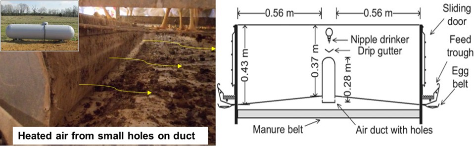 However, this method requires the installation of extra equipment such as an air duct above each manure belt. Installing air ducts above belts to expedite the manure drying speed was reported in a few case studies in cage-free houses. More studies are needed to address how many holes are needed, hole size, and optimum air temperature and speed over fresh manure.