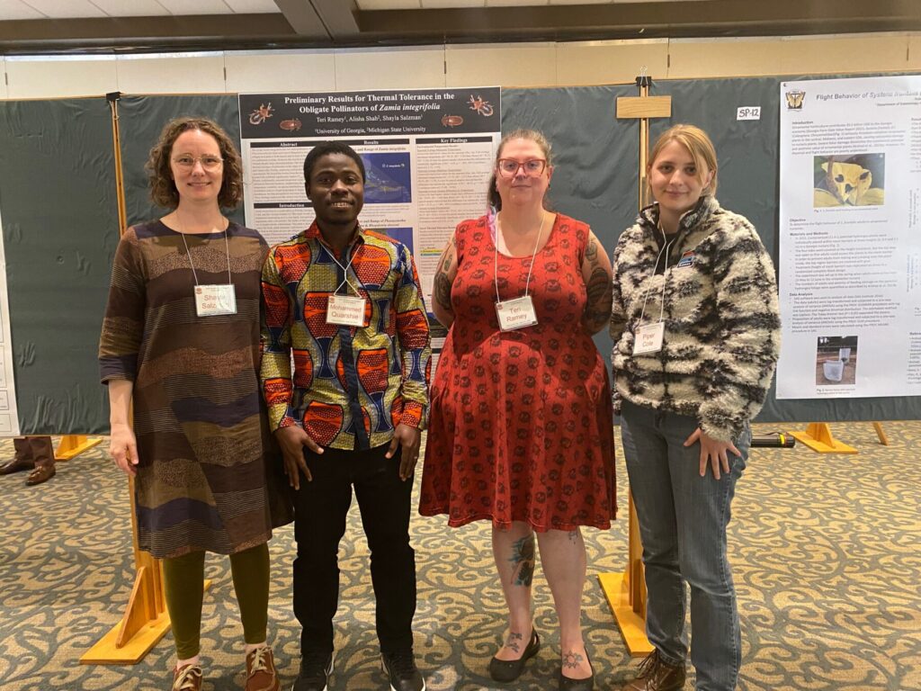 April 2024 – Salzman Lab graduate students Teri Ramey and Mohammed Quarshie present at the Georgia Entomological Society meeting on Jekyll Island. Left-to-right: Shayla, Mohammed, Teri, and Piper.