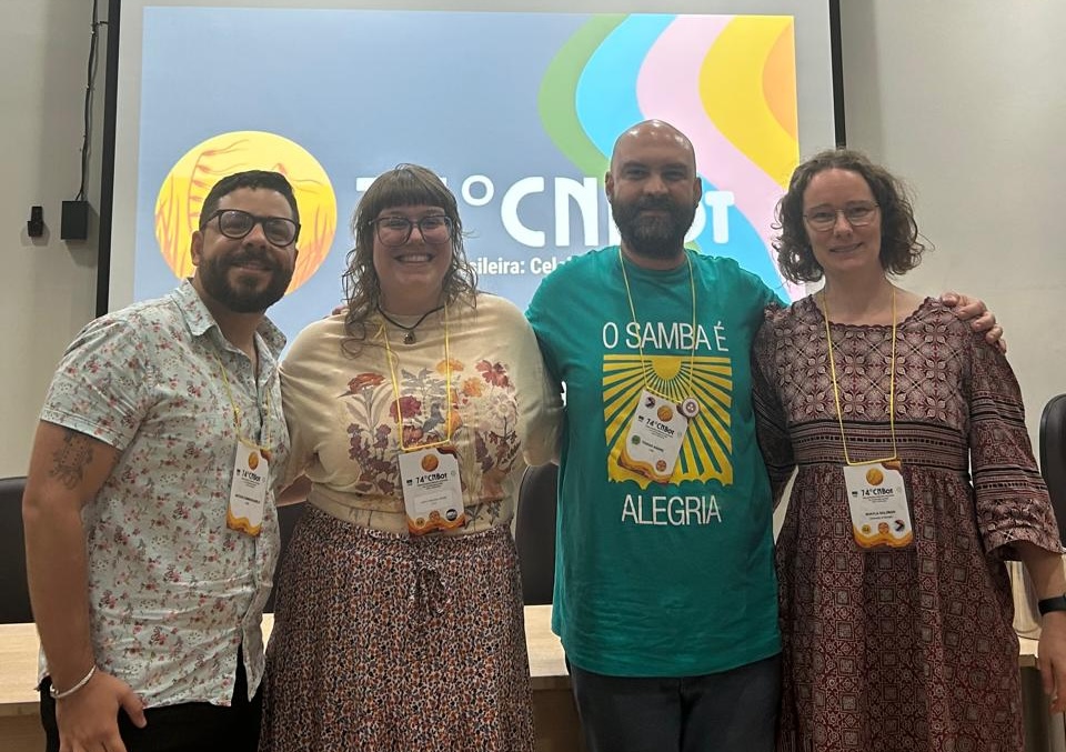 November 2024 – Shayla and Arthur Domingos de Melo host a symposium on plant chemical signals at the 74th National Botanical Congress in Brasília Brazil and Salzman Lab phytochemist Gwen Bode is an invited speaker. Left-to-right: Arthur, Gwen, Congress Vice President Thiago André, and Shayla.