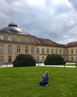 Enjoying the sun on campus in front of Schloss Hohenheim |